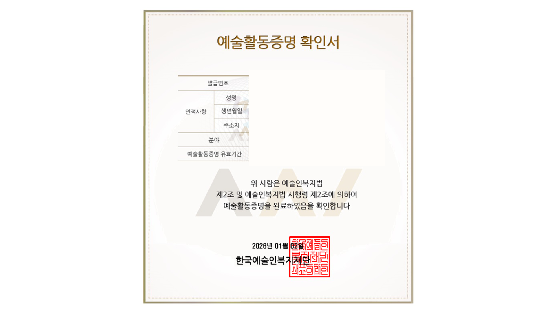 예술활동증명은 예술인 복지법에 따라 예술을 '업(業)'으로 하여 예술 활동을 하고 있음을 확인해 주는 제도에요.