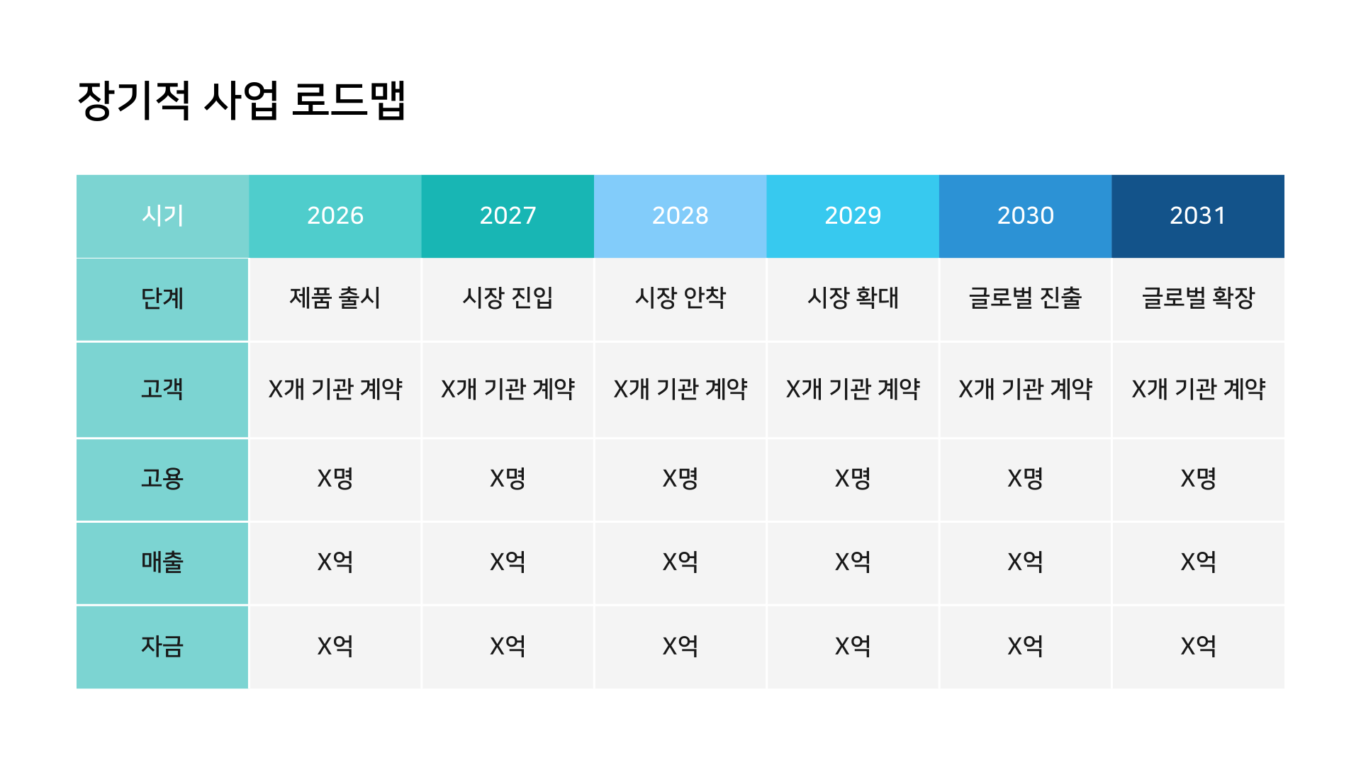 - 2027 (Scale-up): 동남아시아 시장 진출 및 연 매출 200억 달성.