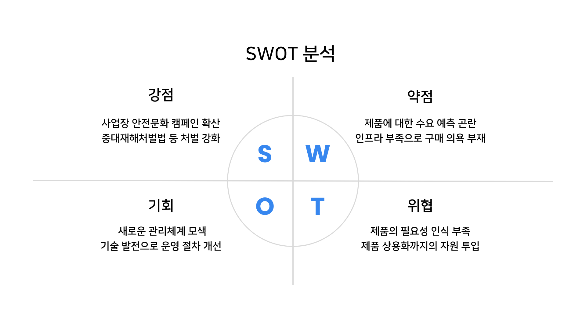사실 SWOT은 "시장의 위협을 어떻게 기회로 바꿀 것인가?"를 논리적으로 설득할 수 있어야 해요.