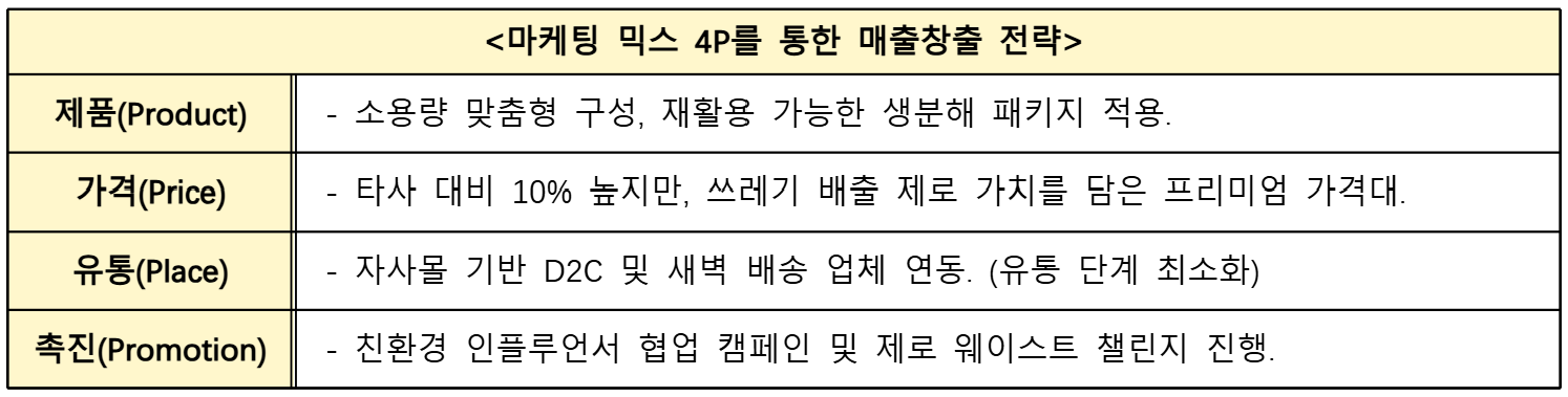 • Promotion: 친환경 인플루언서 협업 캠페인 및 제로 웨이스트 챌린지 진행.