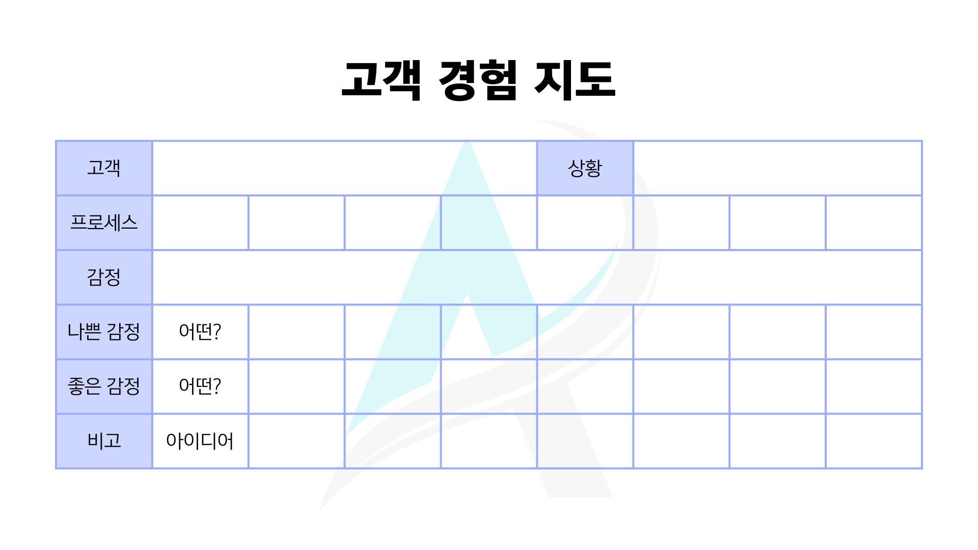 • 질문: "고객은 이 단계에서 무엇을 느끼는가?", "어떻게 하면 이 문제를 해결해 줄 수 있을까?"