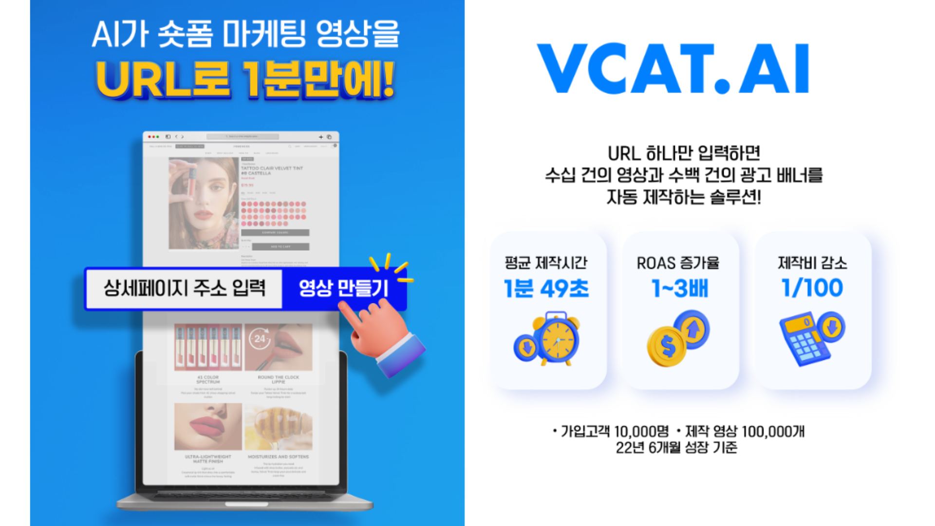 전문 디자인 기술이 없어도 생성형 AI 툴인 브이캣(VCAT.AI)을 활용하면 단 몇 분 만에 여러 광고 소재를 뽑아낼 수 있어요.