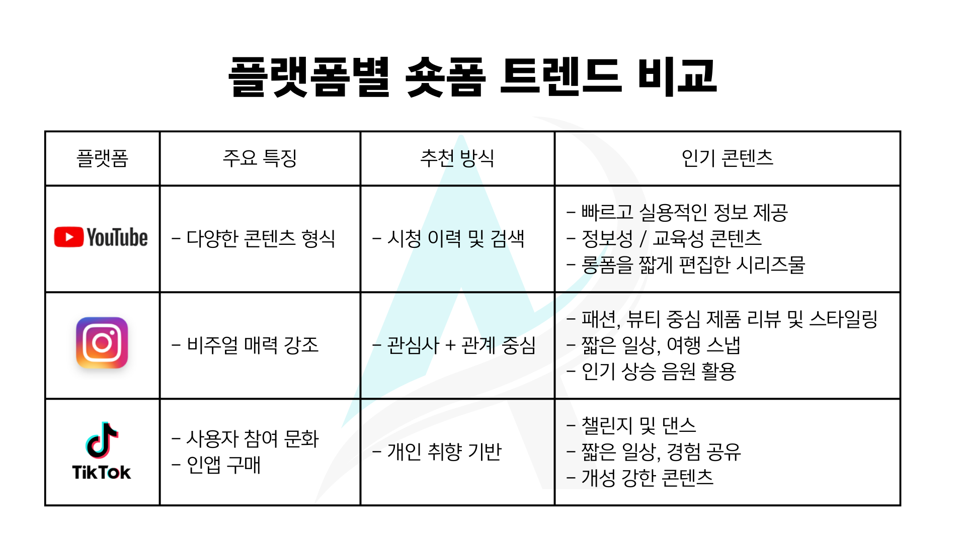 | 강점 | 롱폼 연동, 신뢰도 확보 | 브랜드 이미지, 쇼핑 연동 | 폭발적 확산, 구매 전환 |